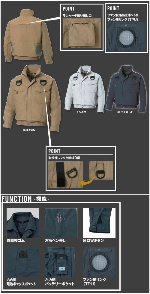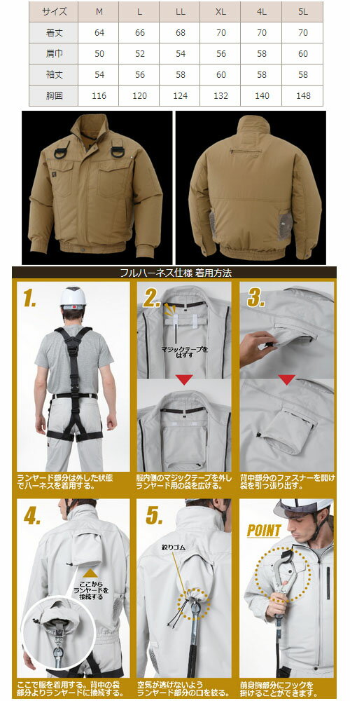 特徴綿100%素材を高密度で織り上げることにより、防風性を高め、空気のモレを少なくした空調風神服に適した素材です。