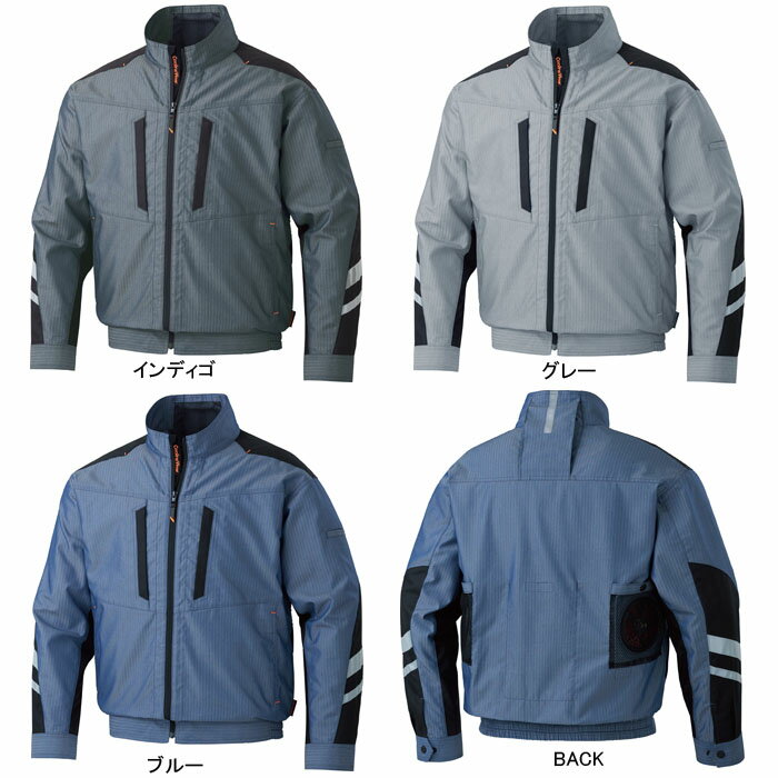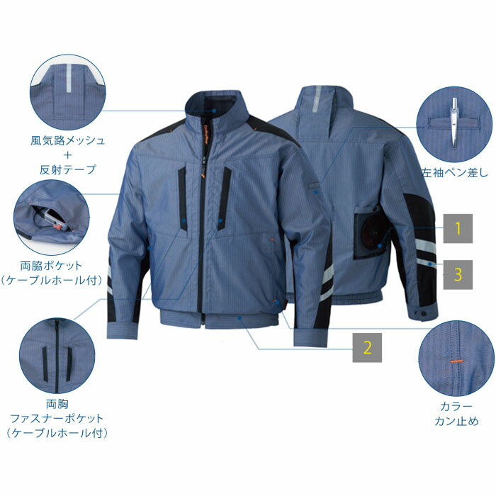 ファン脱落防止ネット付軽やかでタフな薄手ヘリンボン生地両腕の反射テープは、安全性を確保するだけでなく、デザインのアクセントとなっています。