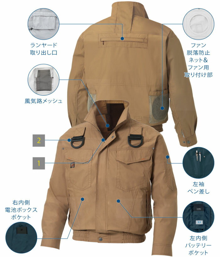 仕様カラー:チャコールサイズ:3L着丈:70肩巾:56袖丈:60胸囲:132フルハーネス風気路立ち襟仕様材質素材:コットンブロード 綿100%ファスナー:フロント/プラスチック、胸ポケット/コイル(引き手:金属)注意※高所作業の際には、バッテリーを所定の内側バッテリーポケットに入れ、落下しないように必ず□を閉めてお使いください。